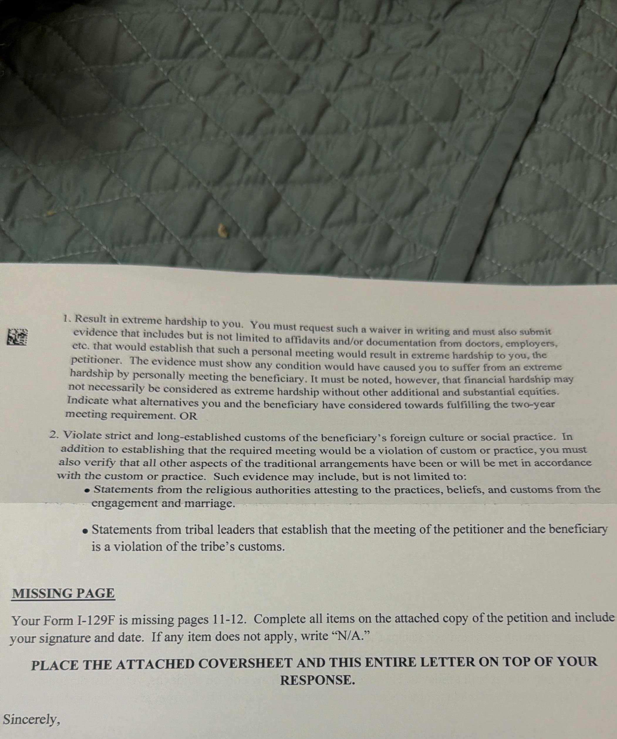 Just got a RFE in the mail for the k1 visa and it mentioned missing pages from 11-12 which were left blank.