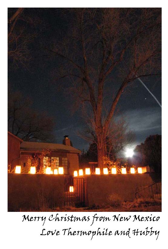 our car blew up (don't worry not violently) on our way to Wy to spend Christmas with my fam. so it's just the hubby and I here in NM. there's a lovely tradition here of lighting luminaria on Christmas eve, so we wandered around the neighorhood taking pictures