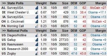 There are really only two items of any significance here. Firstly, Obama continues to hold or slightly improve his position in the national tracking polls. But secondly, McCain got a strong result in Ohio, where the University of Cincinnati's poll for an Ohio newspaper consortium has John McCain 2 points ahead in the Buckeye State. Bonus for McCain: UC's polls have a strong track record. Mitigating factors: about three-fifths of the interviews in the poll were conducted before the debate, which seems to have boosted Obama's standing slightly, and he has improved his position modestly from the couple of polls that UC conducted in September, which had McCain ahead by 4 and 6 points respectively.