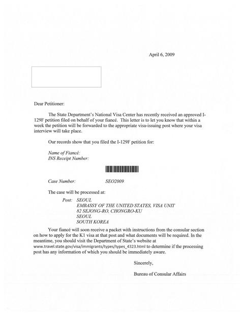 I heard that my case was forwarded to Seoul Embassy on April 06, 2009, although, Seoul Embassy did not receive it yet, it should arrive sometimes next week.