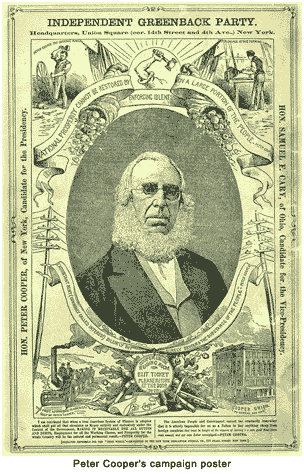 Tensions were heightened during the depression that followed the Panic of 1873. Farmers and debtors bore the brunt of the economic distress and issued calls for the printing of additional greenbacks and the unlimited coinage of silver. These calls for action were transformed into a political movement and, in 1876, into a political party. The National Greenback Party took up the greenback refrain and pledged to fight the Specie Resumption Act (1875), as well. Peter Cooper received the group’s presidential nomination, but polled only about 80,000 votes.