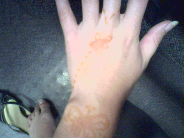 The girl I did the henna on took pictures of it with the camera on her cell phone. They aren't great pics, but neither was my first attempt at henna. Thank goodness it's not lasting long so next time I can actually look at some pictures instead of trying to just think up a pattern.