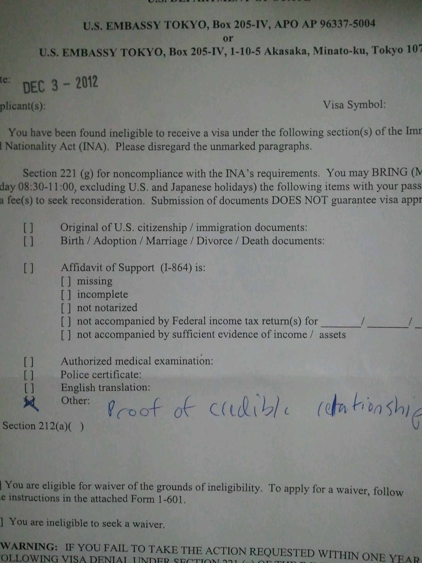 When all was said and done, the officer took her passport and the mailing envelope my wife provided to them, and lastly he issued my wife a 221(g) form, checking the "OTHER" box, which states "proof of credible relationship"...