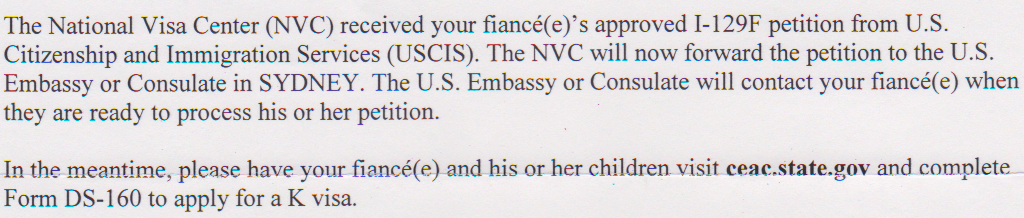 I didn't receive that. I only knew to do the DS-160 from a letter from the NVC saying that they had received the approved I-129F and that they were forwarding it to the Consulate in Sydney.