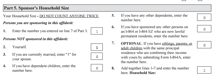 Dakle ako aplikant (suprug ako sam dobro razumeo) nikog drugog ne izdržava (pošto je o tome ovo pitanje) ja bih za ostala polja stavio nule (ne bih samo ostavio prazno). Za delove na koje nemamo odgovora sam do sad stavljao -- (konkretno a number i moje srednje ime) ili N/A odnosno not applicable (u zavisnosti od toga kako je programirano polje, neka ne dopuštaju unošenje / na primer) a nisam ostavljao prazno. Obično instrukcije konkretnog formulara kažu da li te stvari treba ostaviti praznim ili popuniti N/A pa pogledajte uputstva za konkretni formular.