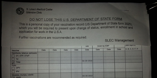 9/28/2015: Medical Exam - Took 3 days... Cho Ray is a mess. Vaccinations delayed until passing Interview because of shortage of vaccinations in Vietnam
