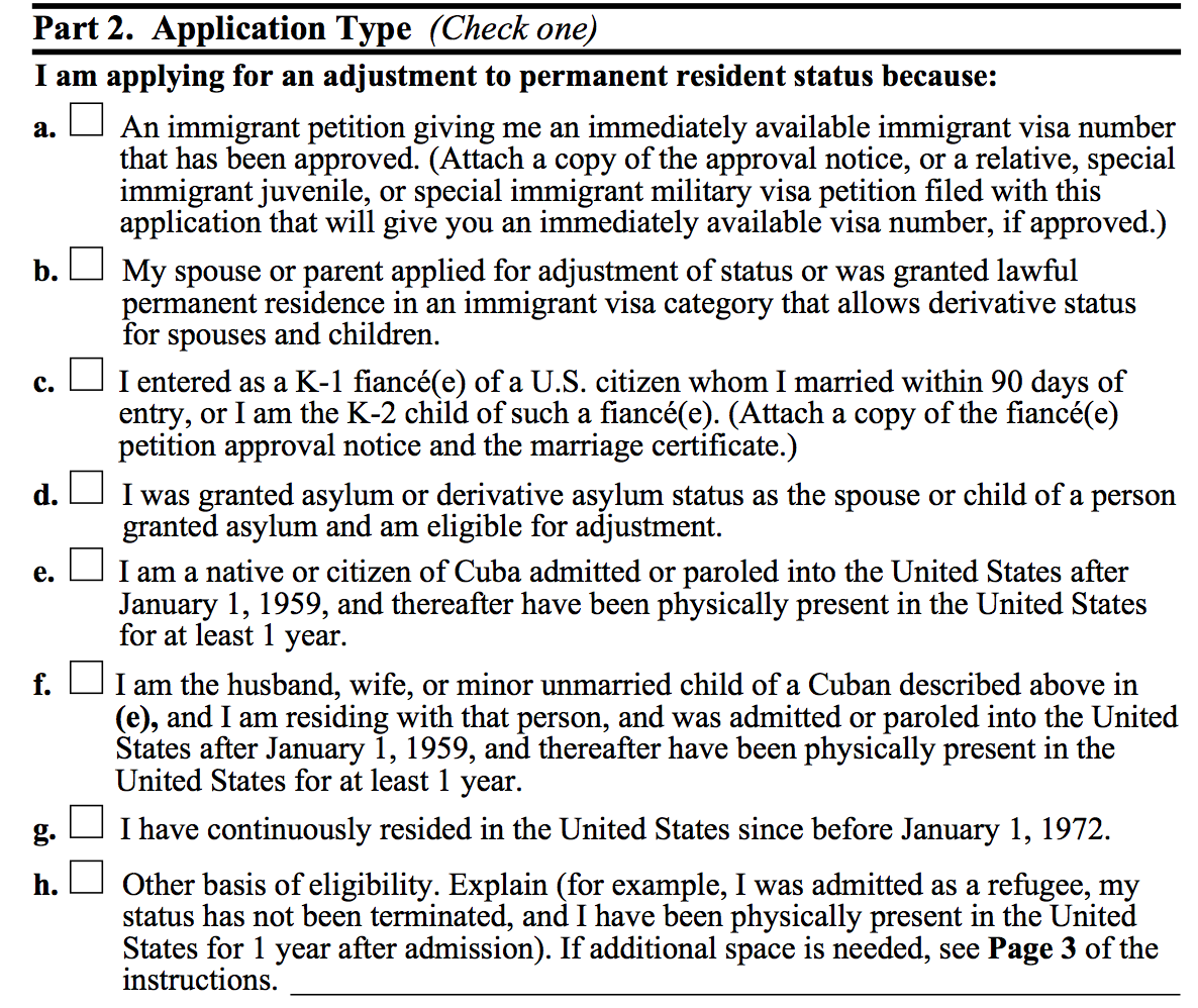 On the I-485 form,for the part 2 section, application type, I don't see any options apply for me. Should I check: h.other and explain my situation?