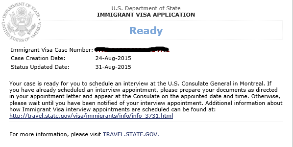 Your case is ready for you to schedule an interview at the U.S. Consulate General in Montreal. If you have already scheduled an interview appointment, please prepare your documents as directed in your appointment letter and appear at the Consulate on the appointed date and time. Otherwise, please wait until you have been notified of your interview appointment. Additional information about how Immigrant Visa interview appointments are scheduled can be found at: http://travel.state.gov/visa/immigrants/info/info_3731.html