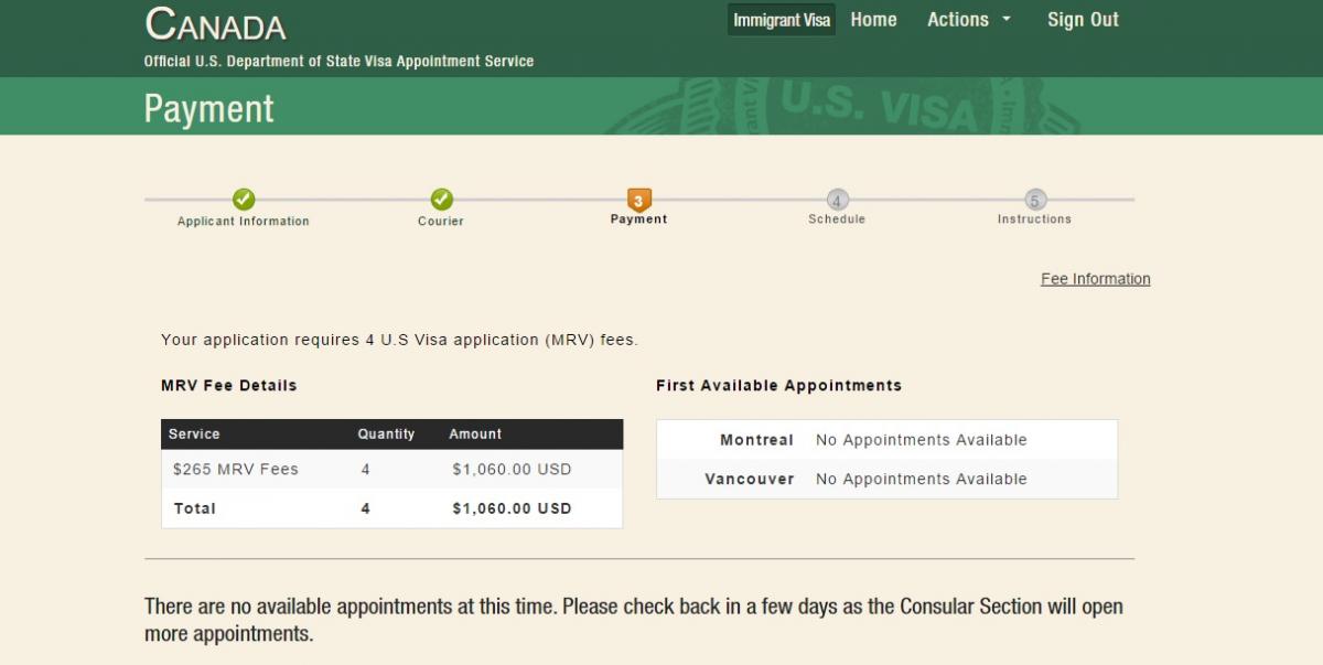 You may want to try e-mailing them as well as calling with detailed information, especially concerning how long you've been unable to access dates. Because I know that dates have opened up for both Vancouver and Montreal (Vancouver dates on the 21st when I was booking my Montreal were available the whole day when I was refreshing... so if neither of them on your side changed and you were checking quite frequently, there's no way it should have said no dates available). I think it's a glitch in their system for some people. You can't pay your fee's unless you can book an appointment, and you can't book your appointment because you can't pay your fee's.