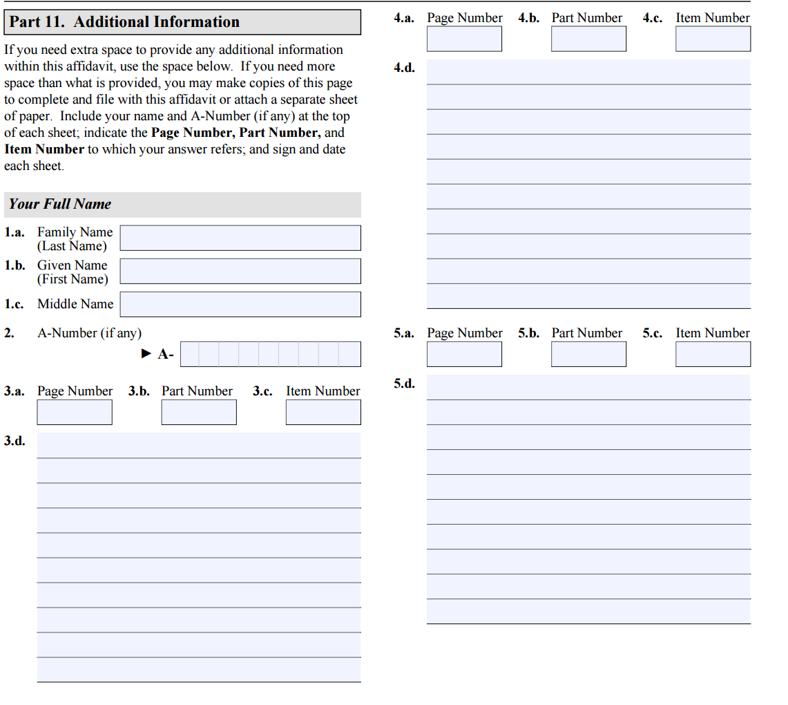 If you need additional space to answer a question in the form, you complete your identifying information--i.e. name and A#--then you tell the USCIS person which question--i.e. page number, item #, etc--that this additional information applies to. If you do not need additional space then leave this section blank.
