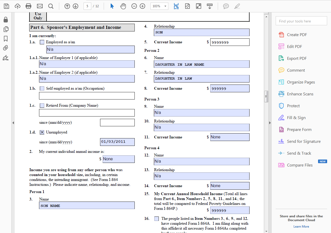 I need help to fill I-864 form.My mother is my petitioner but she is not doing any job there so my brother and his wife will be my sponsor.Can anyone provide me sample form according to my situation..