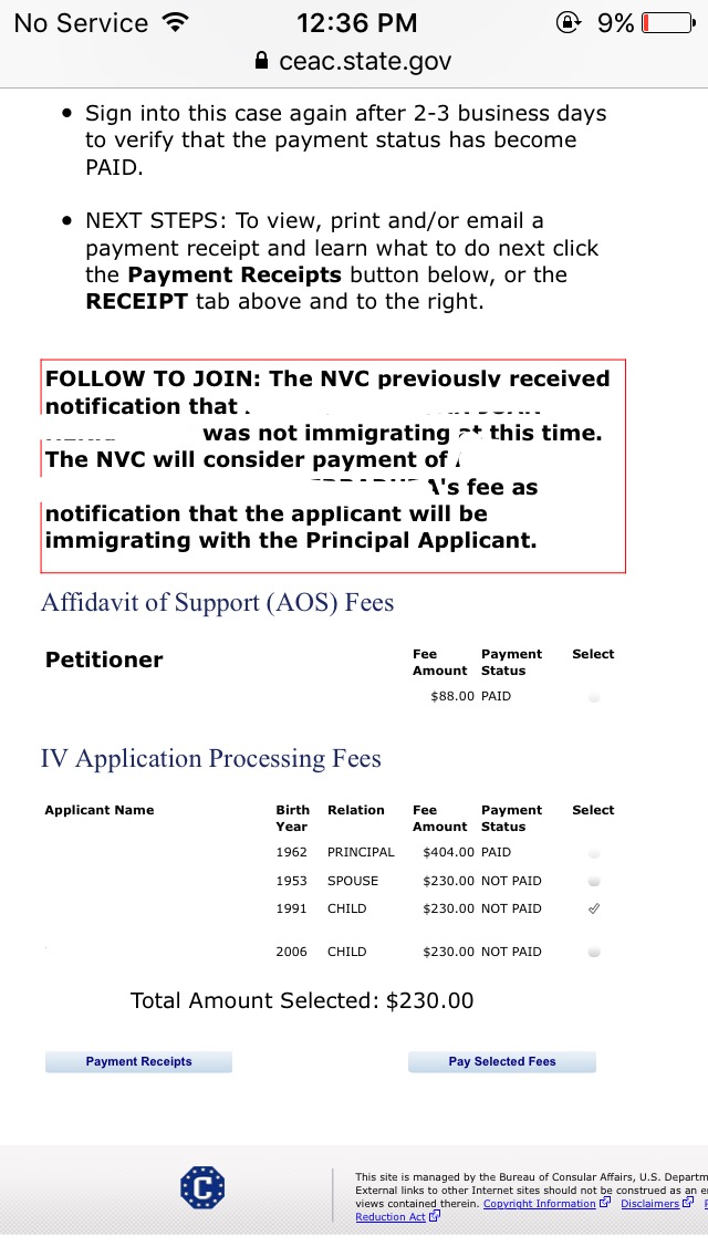 Only the fee for the principal immigrant has been paid. The fee for the spouse and two children has not been paid.