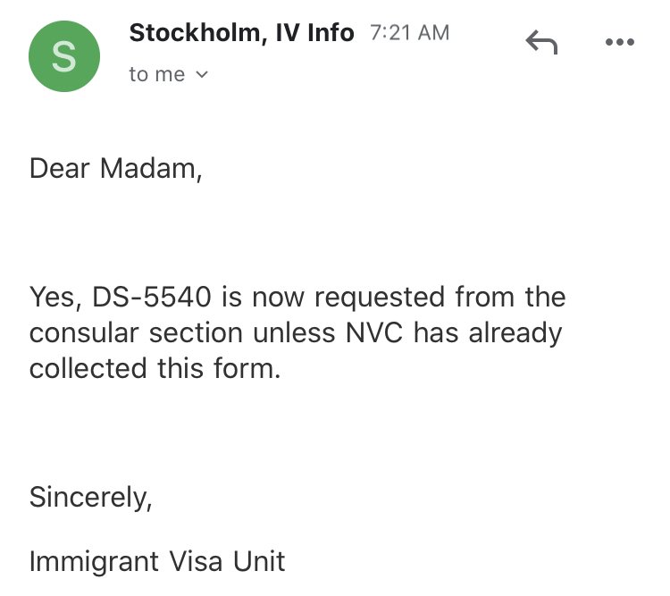 Hi Scandis with upcoming interviews, I emailed Stockholm consulate today to ask if they are requiring DS5540 at interviews since the public charge rule that went into place Feb 24 and they said they are now requiring it. Just a heads up!