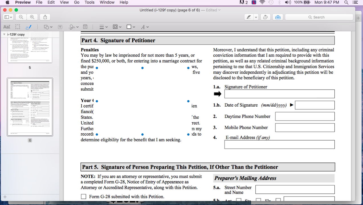 We are filling the first K1 Fiance Visa forms. When I print out the form G-325a and I-129F with Adobe reader, it prints out "Don't forget to sign!". There is no popup when I click on print. I am not going to send the form with the "Don't forget to sign!" text. I am feeling sad because I worked on this for 3 hours with no solution I try works on the internet.