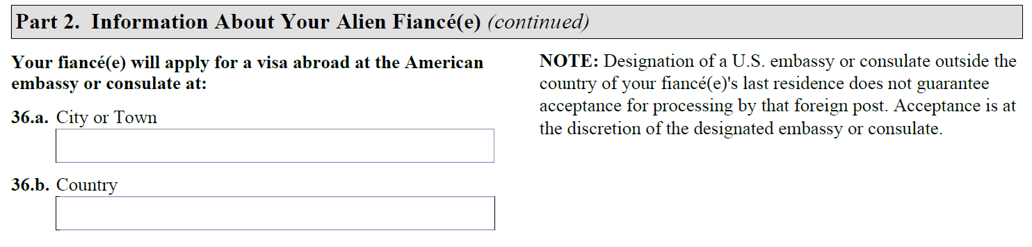 I'm a Brazilian citizen already living in Vancouver, Canada for 3 years under a student visa. I'm filling the I-129F and I have one doubt about the question below, Part 2 - Question 36.a, about the embassy.