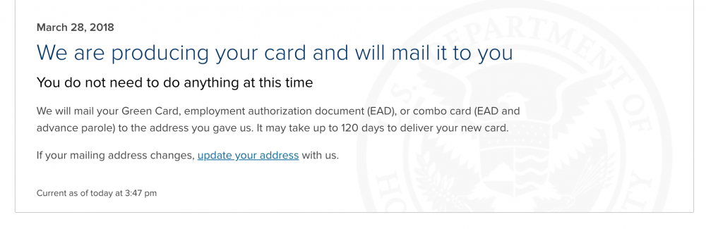Well that was fast, given that I saw the approval notification update on there yesterday (but have checked this site 2x times today and only now is this update appearing). Hopefully it doesn't take 120 days to receive!