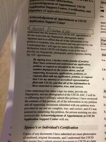 so why is there the acknowledgement of ASC application center fingerprints and photos in both parts of the form? do i just sign my name in them both? she doesnt sign those at all? so i assume i have to sign that twice? same thing but on different pages?
