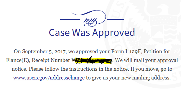 On September 5, 2017, we approved your Form I-129F, Petition for Fiance(E), Receipt Number WAC1790287313. We will mail your approval notice. Please follow the instructions in the notice. If you move, go to www.uscis.gov/addresschangeto give us your new mailing address