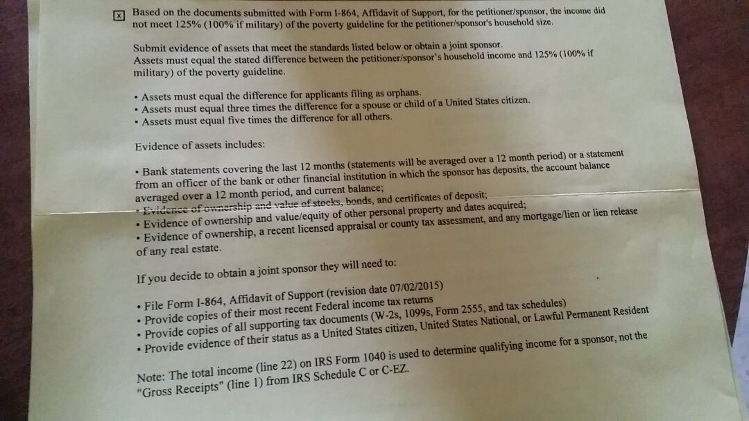 Sometimes people just forget to include one item for supporting evidence and they get the same letter about getting a sponsor or assets.