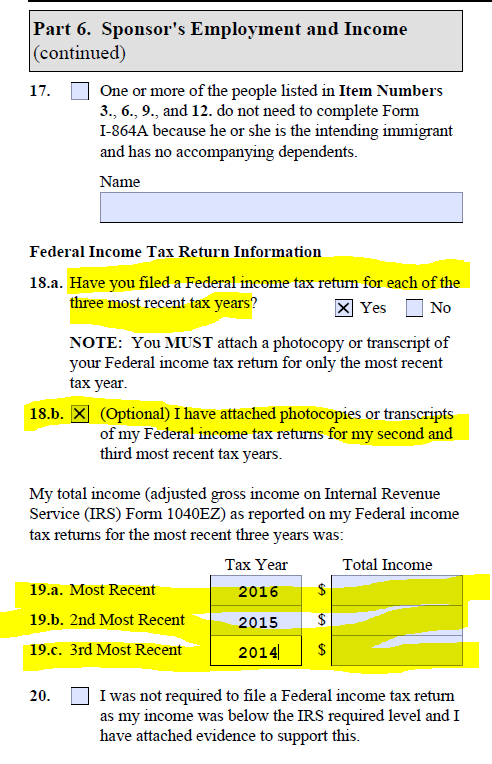 Question: Since we were filling jointly, do I need to put mark on 18a as YES, that I filed the Tax returns and if Yes, do I write our total income in each year in part 19a-c, lets say $40,000( my husband's[40,000] + mine[ 0 ] ) or do I have to put only mine, which [ 0 ] for all 3 years? In his form I-864a he will provide information of his income and tax returns.