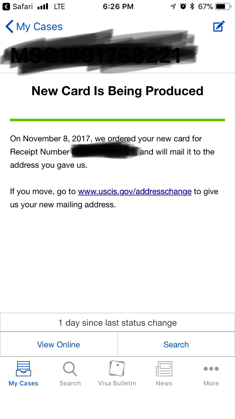 2/26/18  --- USCIS Mobile Status changed to "Card was mailed to me"