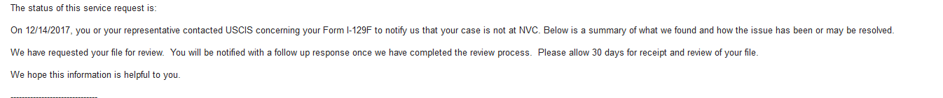 oh no! yeah we got that reply also. Well USCIS it is for you then! Im sure it'll turn up. I have a feeling that have shipped some off to the NRC instead of the NVC
