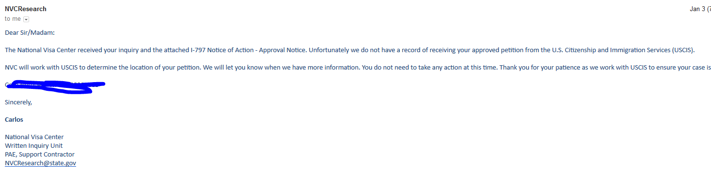 Yup emailed NVC research 2 seperate occasion and also put in an inquiry with USCIS Dec14th