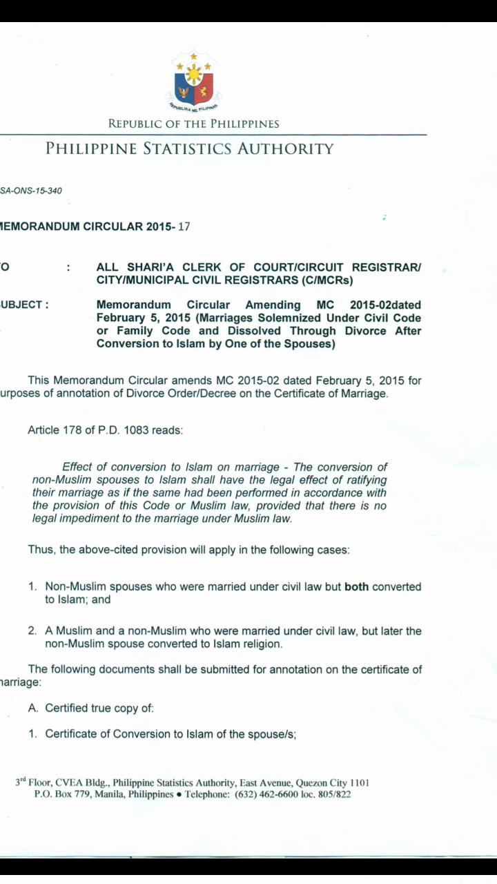 Yes i had read and understand those post about Sharia divorce denied..My concern is Christian wedding and civil wedding are different..Under article 178 PD 1083 Civil wedding can be dissolve and divorce by conversion.. PSA issue memorandum circular 2015 - 17 those were married under civil wedding can be ratify by conversion..Christian wedding and civil wedding are different but the same legal in Philippine law