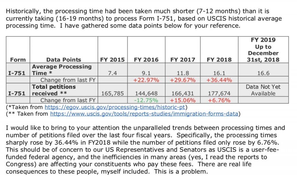 I want to share with you that I wrote to my US Representative and Senators today to request for an enhanced oversight over USCIS’s operations.  I took up the issue with I-751 and showed the data that the rising processing times appears unmatched by the number of applications (see attached picture for a small part of the letter).  The Democratic representatives are generally tougher on agency oversights (in a sense of making sure that USCIS serves the people paying them, not all the taxpayers, because it is a 95% user-fee-funded agency).  The taxpayers money goes to the enforcement branches (CBP and ICE) of the Department of Homeland Security.