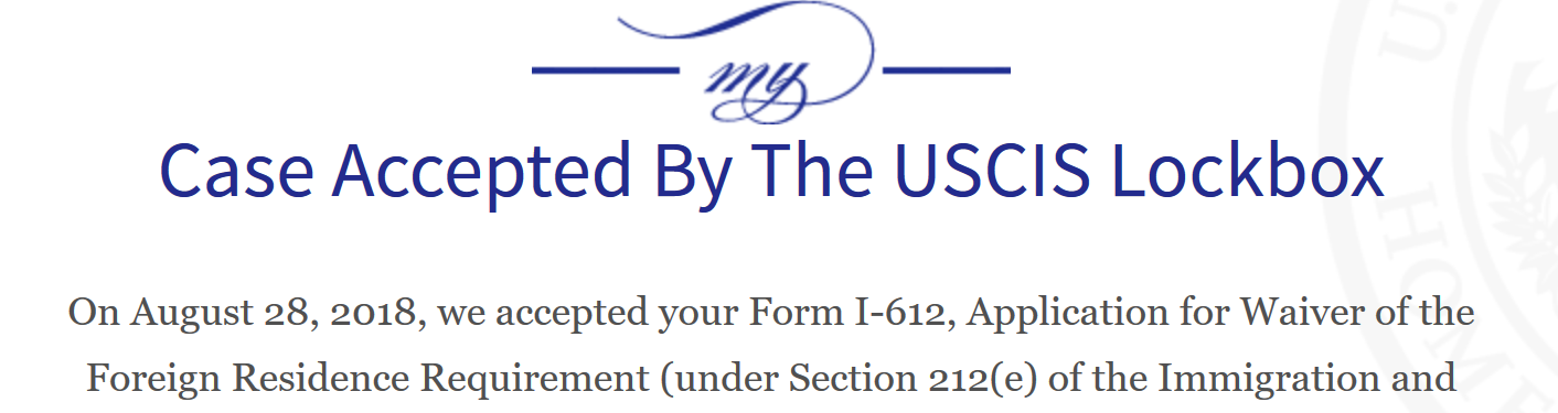 On September 26, 2018, we received your Form I-612, Application for Waiver of the Foreign Residence Requirement (under Section 212(e) of the Immigration and Nationality Act, as Amended), Receipt Number EAC18256XXXXX, at this office for processing from another office. We mailed you a notice that describes how we will process your case. Please follow the instructions in the notice. If you move, go to www.uscis.gov/addresschange to give us your new mailing address.