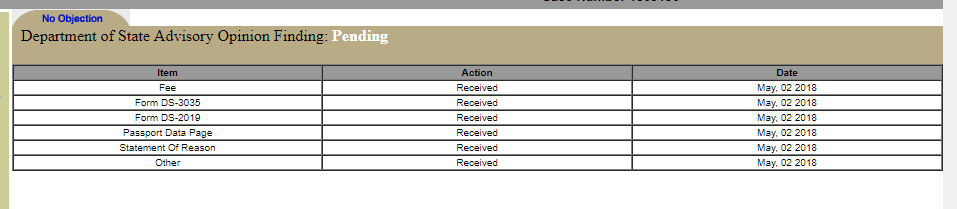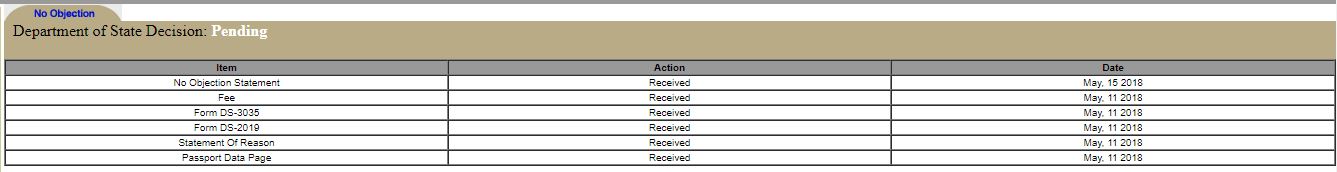 I'm applying for a J1 waiver under the "no objection" basis, I am subject to the 2 year rule because of the skills list requirement. DoS received my no objection statement on April 13th and I still haven't received any response from them. Here's my official timeline: