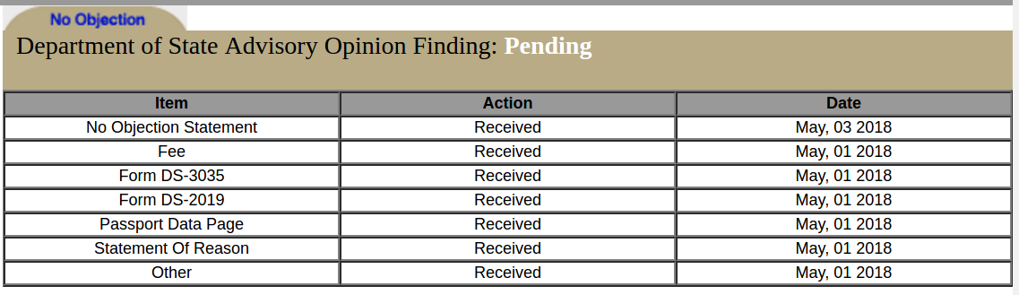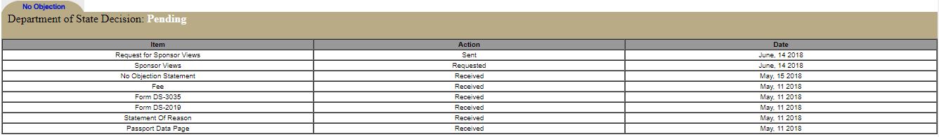 Small update on my DOS timeline. Sponsor views were requested. It took about one month from the time the DOS reported they received my no objection statement.