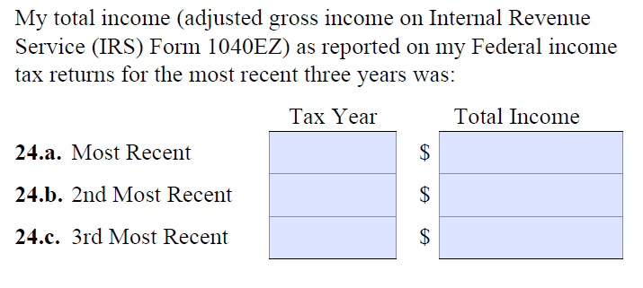 "Item Numbers 23.a. - 25. Federal Income Tax Return Information. You must provide either an Internal Revenue Service (IRS) transcript or a photocopy from your own records of your Federal individual income tax return for the most recent tax year. If you believe additional returns may help you to establish your ability to maintain sufficient income, you may submit transcripts or photocopies of your Federal individual income tax returns for the three most recent years."