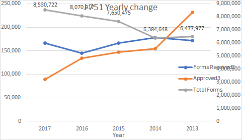 With annual average number of applications around 160,000 cases (even including fiscal year of 2017), USCIS approves cases 140,000 annually until 2017 fiscal year.