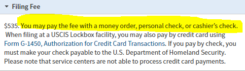 Thanks for sharing—these are the same guidelines we used before submitting our petition. We had already used a money order when we tried to send a petition in October of last year, but the package disappeared somewhere between sending it and USCIS receiving it (they never had it on file, we didn't have appropriate tracking, and it was never returned to sender) so we didn't want to use that option again (or the credit card one in case it got lost again). My fiance, unfortunately, had no personal cheques so we decided to go for a "cashier's check", but the "teller's check" is what was given to us by the bank when we asked for a "cashier's check" so we thought it was the same thing. I will be sure to update on the result of our re-filing, especially if it turns out that it was actually the cheque that was the issue.