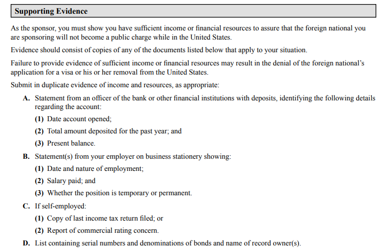 • Documents to support current income: letter of income verification from your employer & some most current pay stubs. Complete list can be seen o I-134 instruction