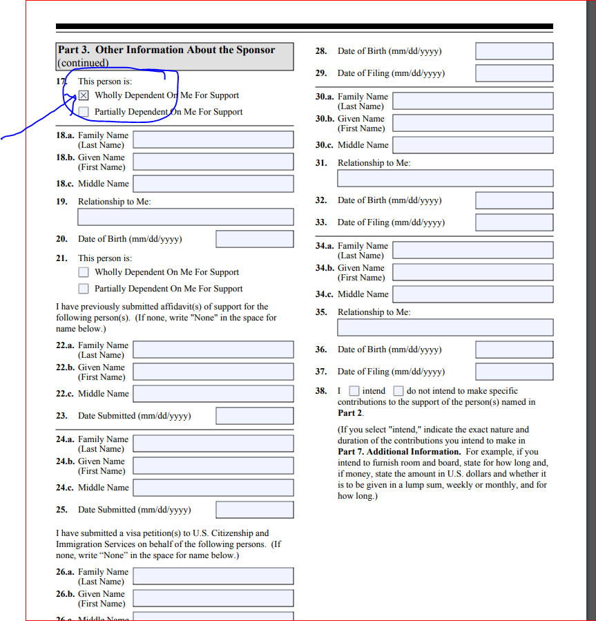 Hello, Any one has any insight on filling out the affidavit of support form. I am looking at the item 17 on part 3 of the form - other information about the sponsor: