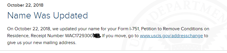 On October 24, 2018, we received your Form I-751, Petition to Remove Conditions on Residence, Receipt Number EAC1729xxx, at your local office. If you move, go to www.uscis.gov/addresschange to give us your new mailing address.