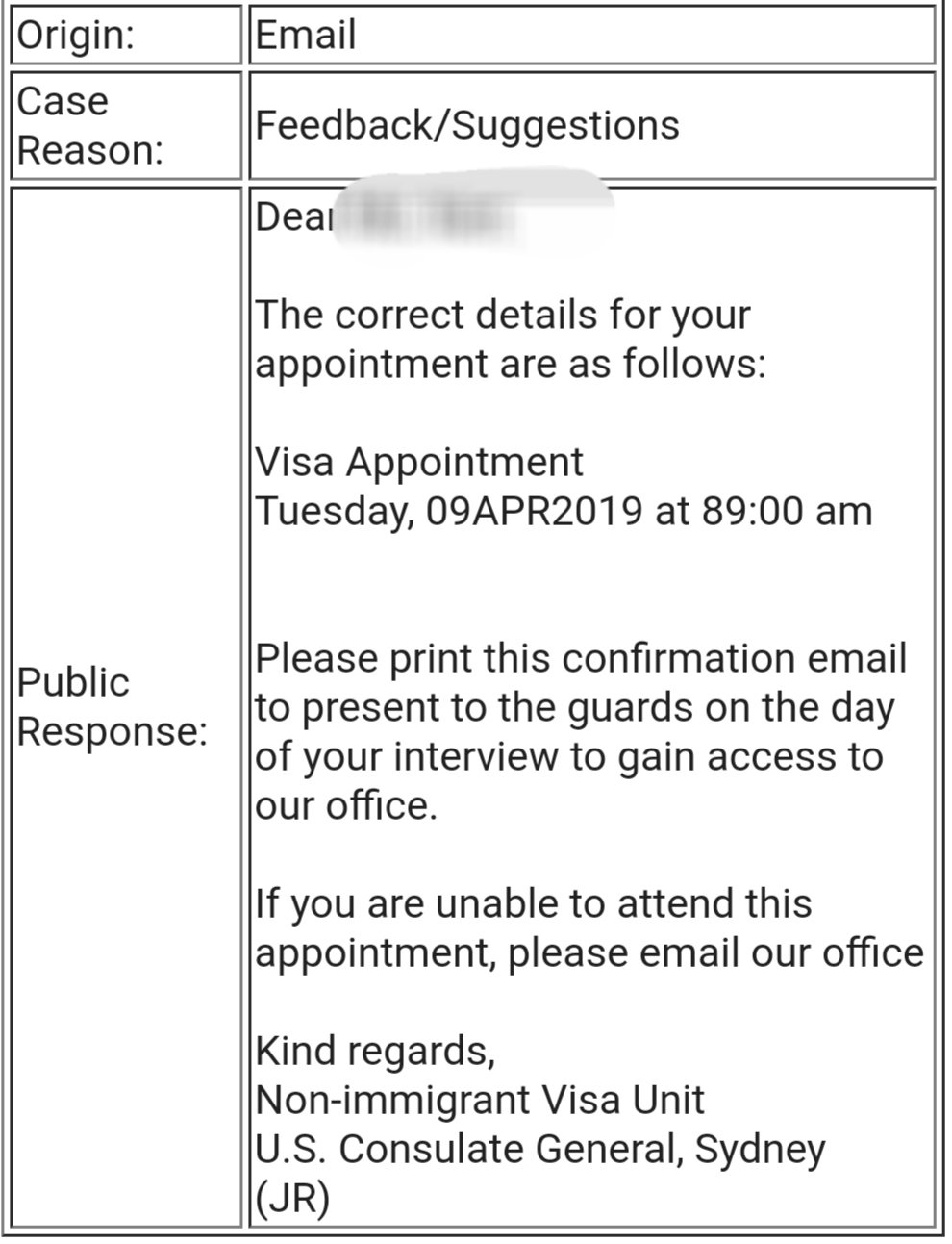 The Consulate in Sydney emailed me my packet 4 on Friday March 29, 2019. The email they sent was blank. It contained no text in the body at all. All I recieved in this email was three attachments; a copy of my approved petition, the 'K Required Documents' pdf and the 'K1 Document Cover Sheet' pdf. From looking through Visa journey I was acutely aware this email should not be blank. I proceeded to lodge multiple enquiries with the consulate including phoning the 'call centre' and the robot line.