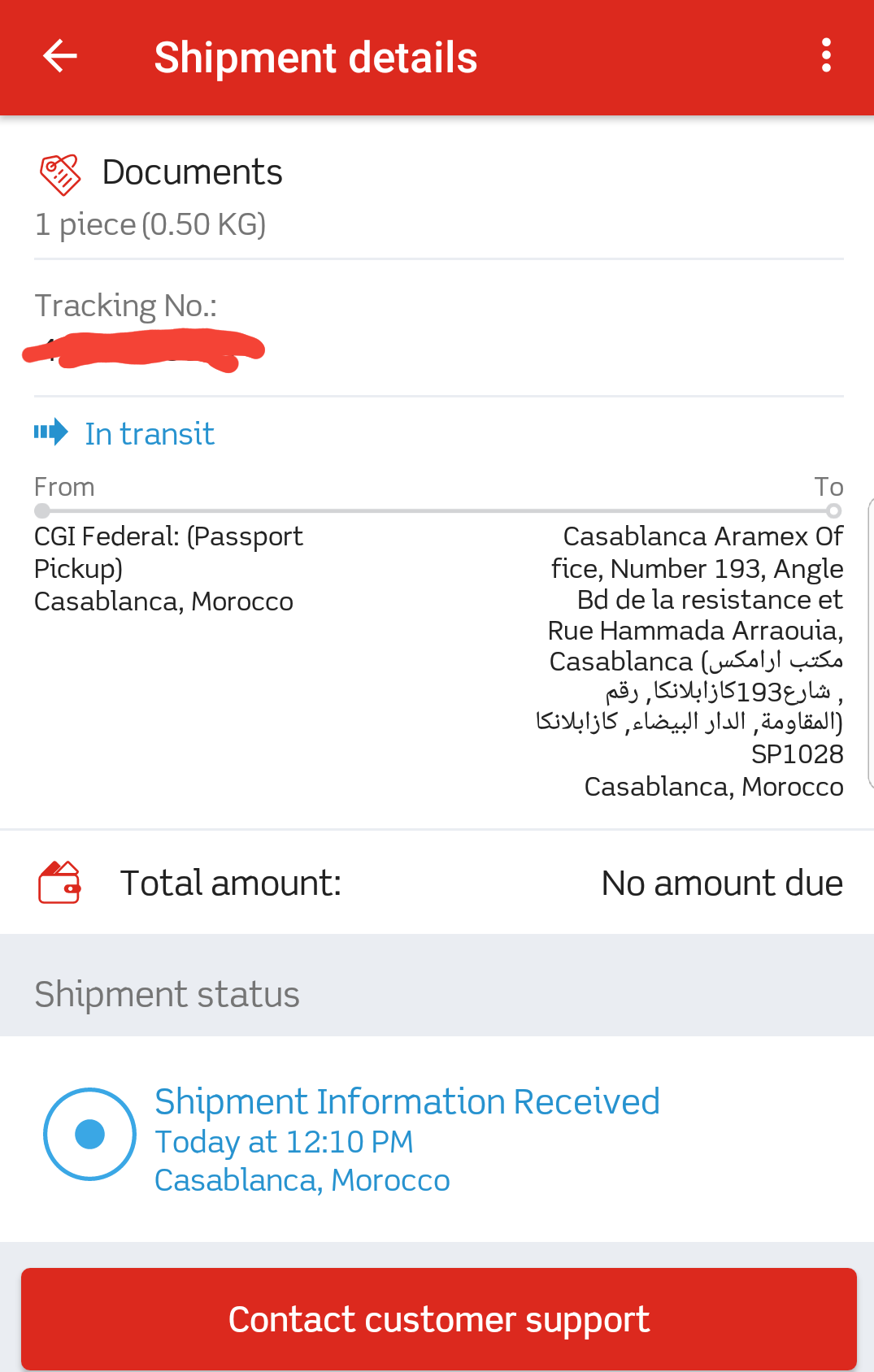 Kindly visit ARAMEX personally to collect your passport under AWB No ******** For further information please call 212 522271414 . Aramex