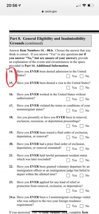On the I-485, do I have to check off 14 and 15 (see picture ) and explain my reason? I am unclear about "Refused" vs "Denied" since legally they aren't the same word and also since the "TN Visa" is not a visa per say but a status. I am tempted to check off yes to both but I wanted to know if anyone else has run into this situation before. I am currently also having my lawyer look into this.