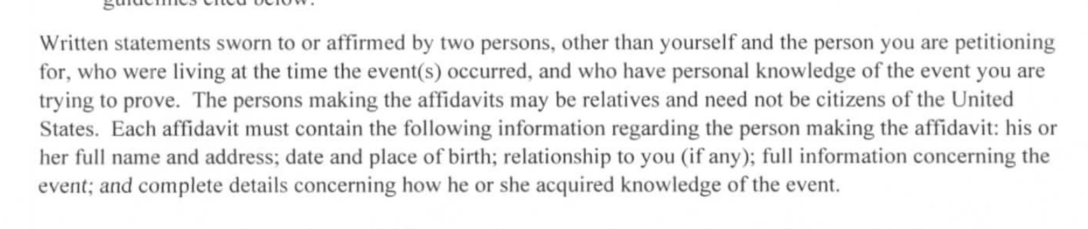 "Written statements sworn to or affirmed by two persons, other that yourself and the person you are petitioning for, who were living at the time of the event(s) occurred, and who  have personal knowledge of the event you are trying to prove..."