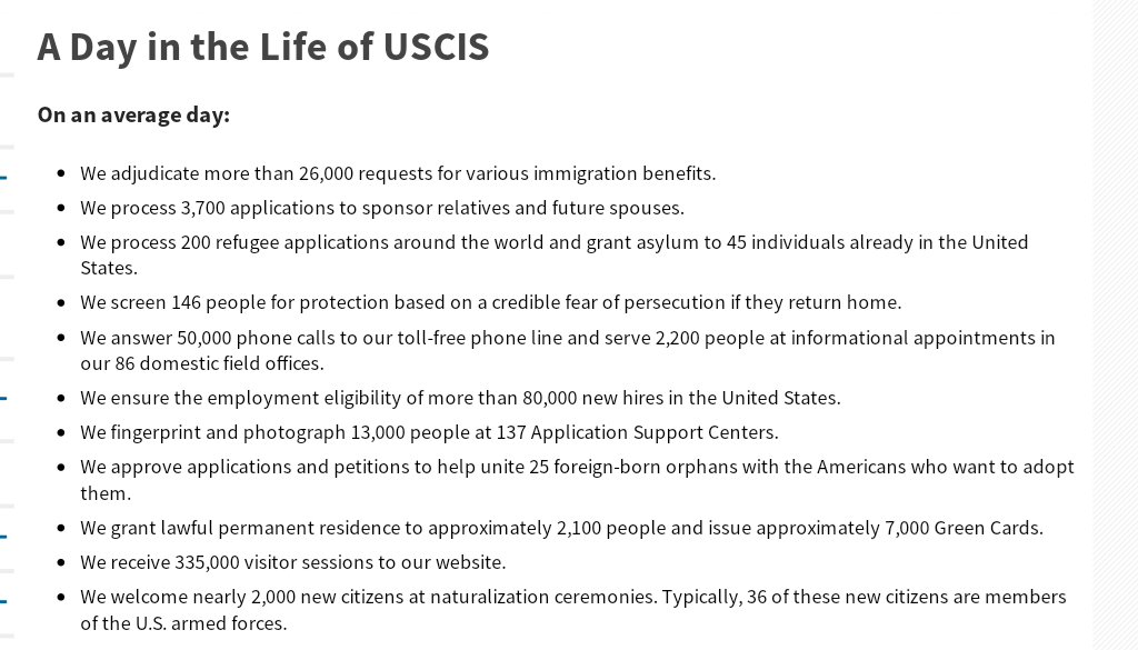 From the visa petition stage to post-entry applications for immigration benefits, USCIS works closely with the U.S. Department of State (DOS), other U.S. Department of Homeland Security (DHS) components, and other partners to ensure that those seeking to lawfully enter and remain in the United States are screened and vetted thoroughly at multiple points and by multiple agencies in accordance with laws and regulations.