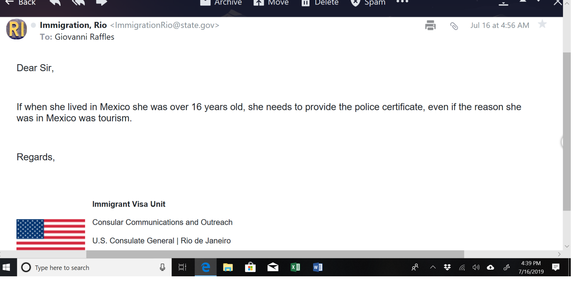 The embassy in Rio, Brazil for the interview, asks for the police report of any country weather she was residing or tourist,
