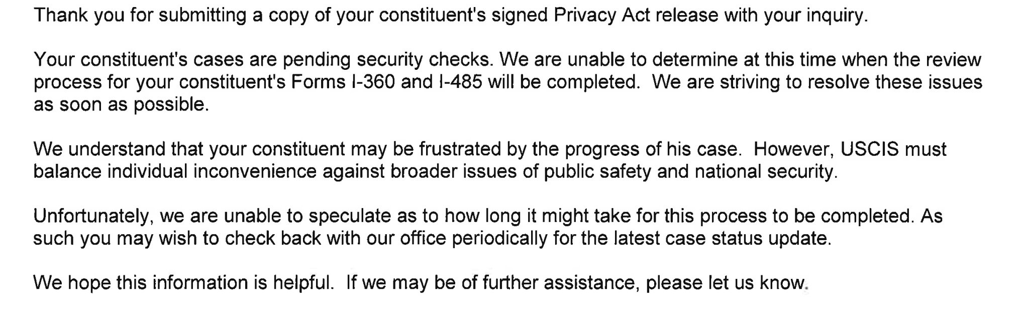 Hello everyone, hope all is going well. With the same standard and usual message from USCIS to my Congresswoman.