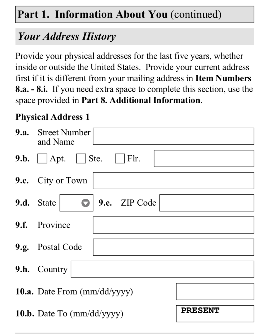I downloaded the I-129f directly from the USCIS website. I can edit all the fields in any PDF viewer but I cannot modify the first form for Address History in Part 1.  Also the Date To is prefilled to "PRESENT" and I cannot remove it.  Does anyone know whether this is meant to be left blank?  I thought maybe it was dependent on the previous question which asks if your mailing list is the same as your current physical address, but whether I check YES or NO this part of the form is still uneditable.  In my case, my mailing address is my current address, so should I just leave this blank?