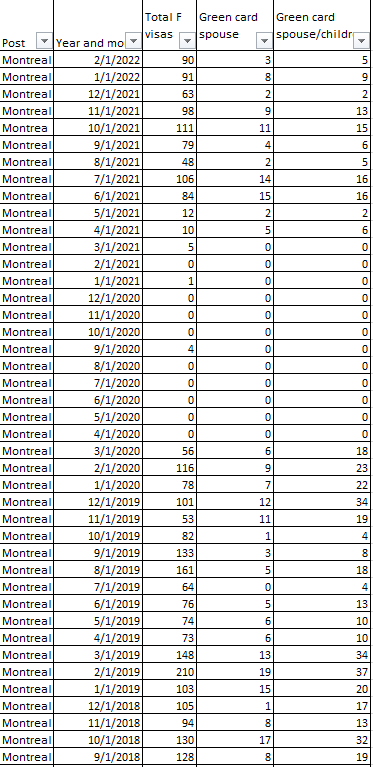 As for F3 & F4, they’re the relatives of US citizens. The Montreal Post prioritize their cases over green card ones, I guess.