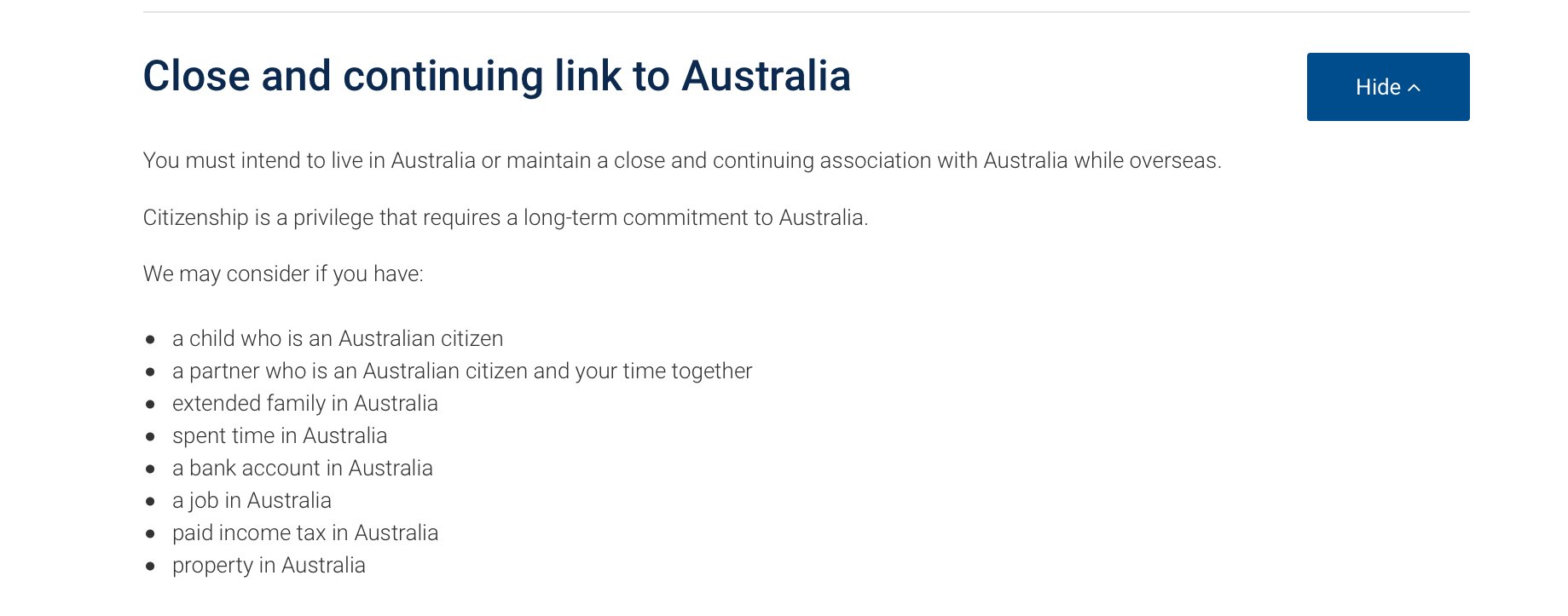 basically, you need investments here, plus family that you regularly come home and visit..and your super (>200k) as a born Aussie or risk loosing citizenship... I’m sure the requirements would be similar or stricter on a resident that converts