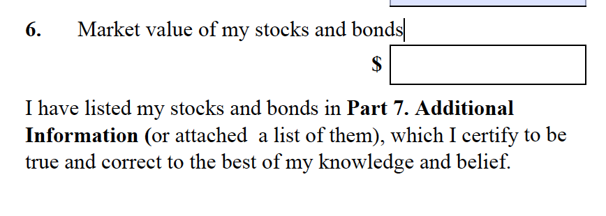 See attachment.  I do have stocks and bonds.  My question is if i have other sources of income proof do i actually need to attach the stocks?  I use a robo service that constantly buys and sells hundreds of stocks so it would not be accurate.  I don't know what stocks I own at any given time.  Should I put $0 If i don't plan on attaching them or fill it out with the current amount and just not attach?
