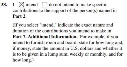 In the new revised I-134 form dated 2/28/2021 - Question #38 now regards contributions.  You leave the yes/no boxes "unchecked" and your explanation is submitted in Part 7 on page 8 of the new form.